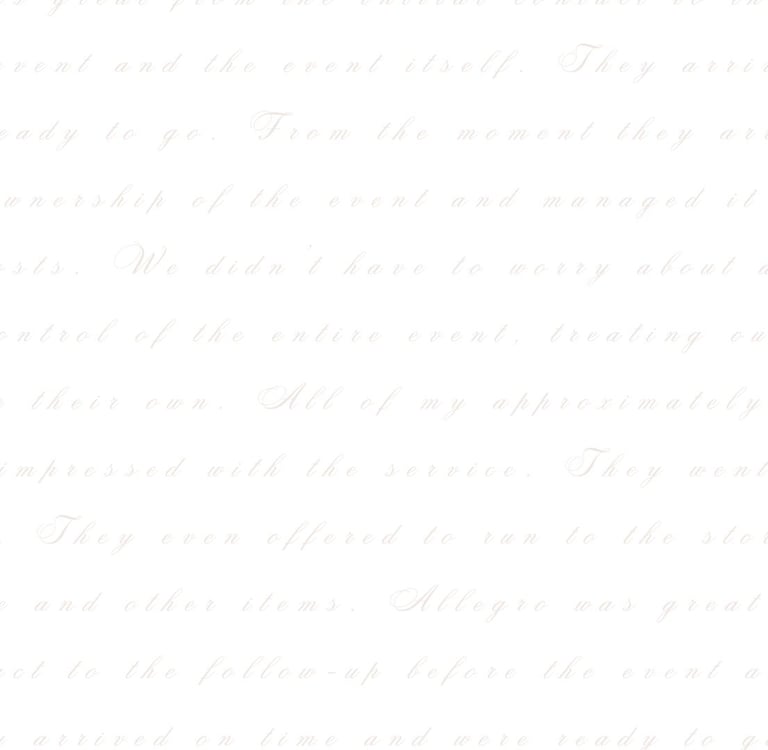 Allegro was great from the initial contact to the follow-up before the event and the event itself. They arrived on time and were ready to go. We didn’t have to worry about anything—they took control of the entire event, treating our guests as if they were their own. All of my approximately 500 guests were very impressed with the service.